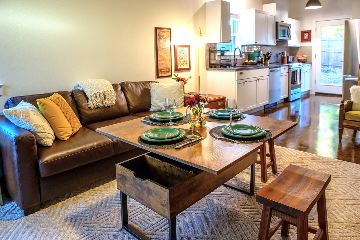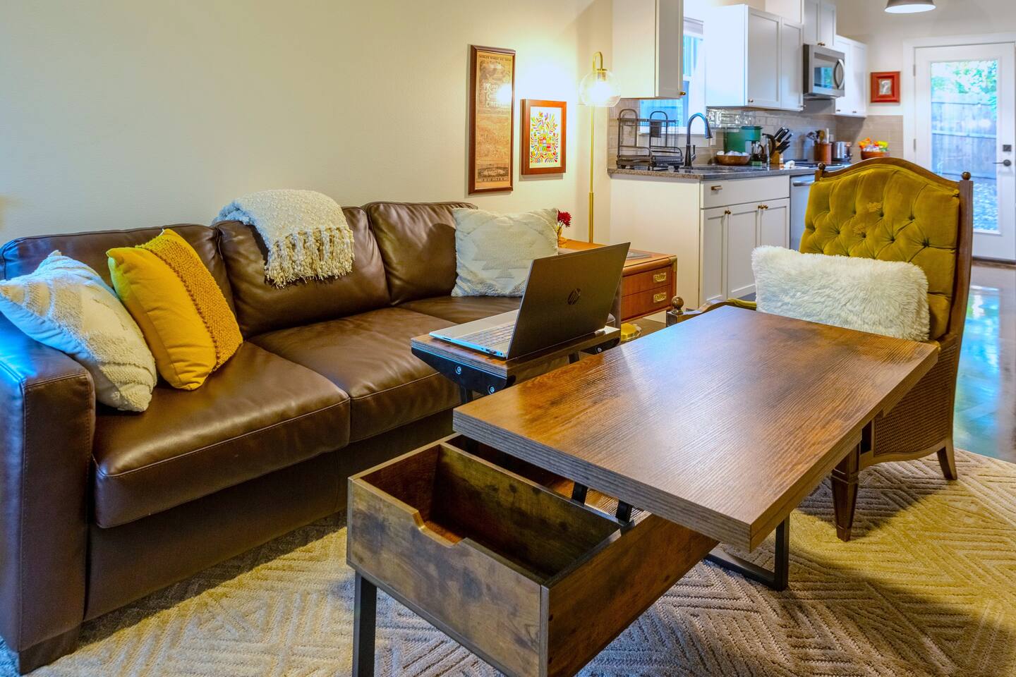 Stylish & ultra-convenient to UNT, TWU & I35! Quiet, private, luxe with a dash of cheeky. Nestled among trees on a street steeped in mid-century design, get away from it all or get work done. The comfy, clean and modern space is complemented by restored pieces, vintage touches and local wares. 2 bedrooms with ultra-comfy queen beds + dedicated baths, plus queen sleeper sofa with new memory foam mattress. New kitchen stocked with extras. Positively, delightfully Denton! We're on FB & the 'Gram!